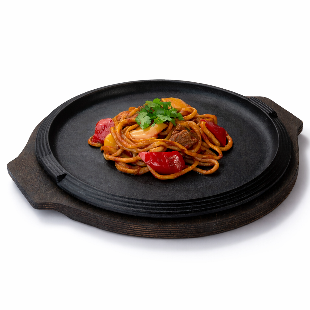 Обжаренная на огне домашняя лапша с бараниной и овощами.