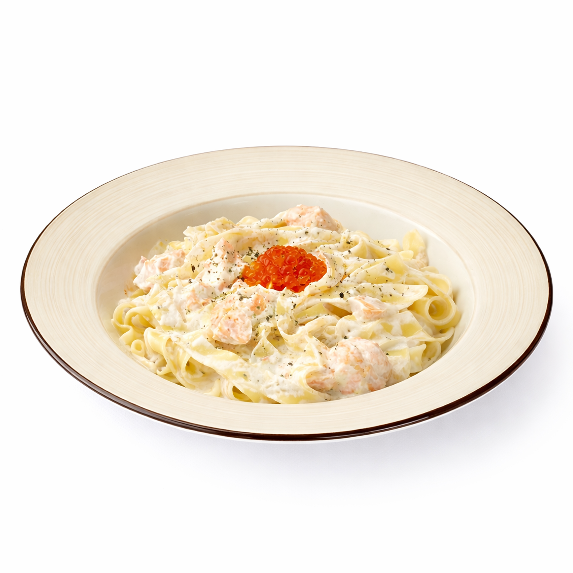 Феттучине, лосось и икра в сливочном соусе. Подается с розовым перцем.