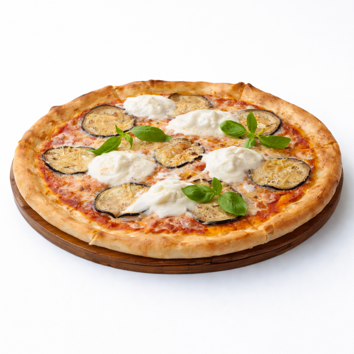 Томатный соус, баклажаны, страчателла, пармезан, моцарелла и чеснок.