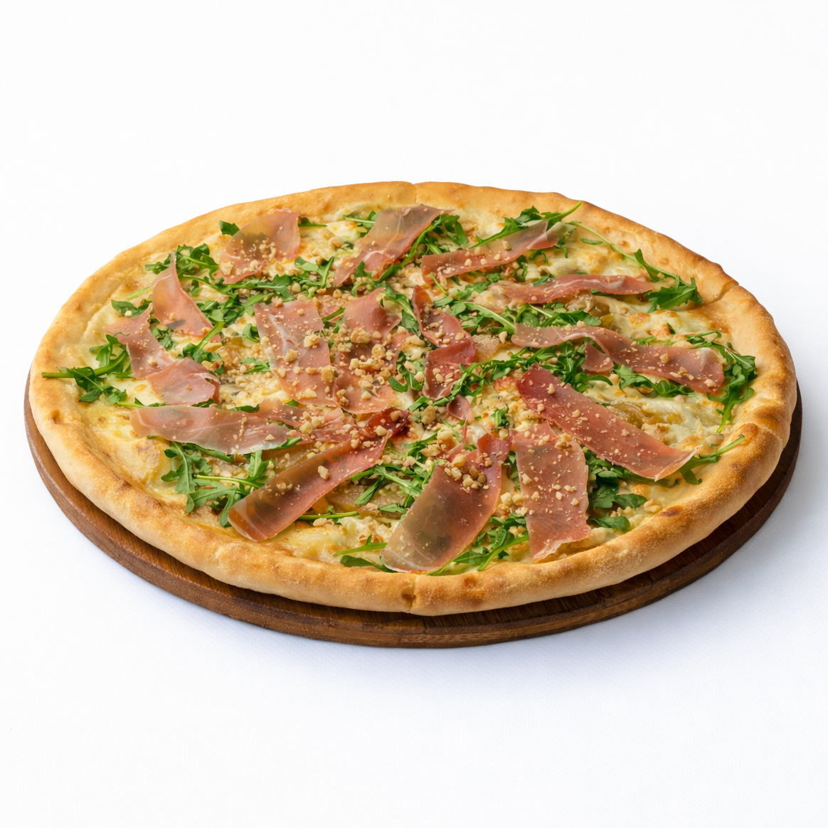 Сливочный соус, фламбированная груша, дор-блю, моцарелла, прошутто, руккола и грецкий орех.