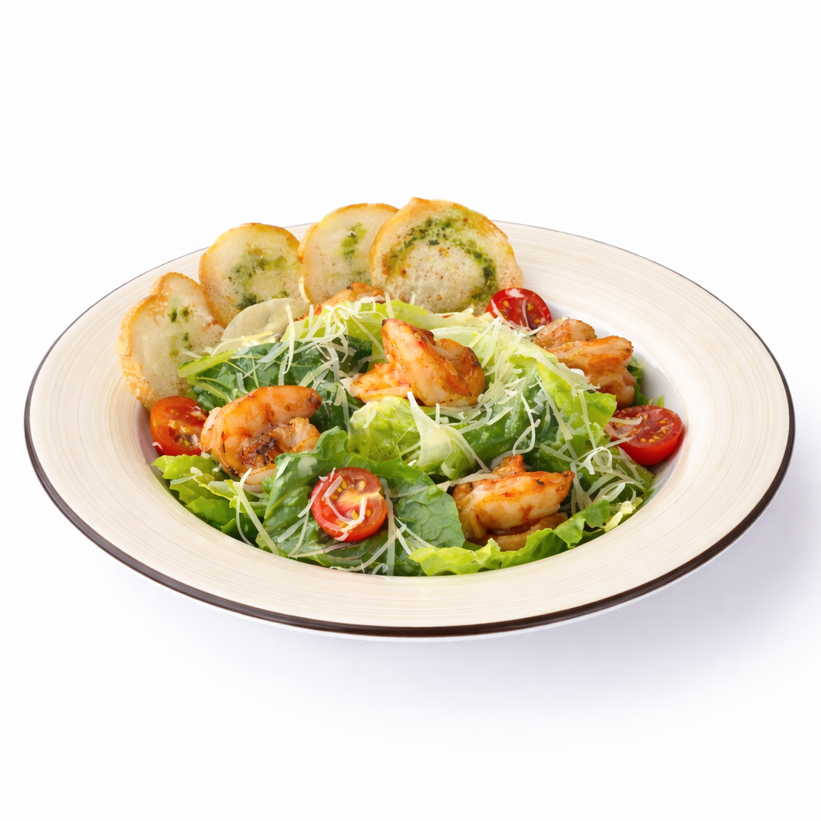 Салат романо, пармезан, черри, гренки и королевские креветки.